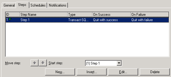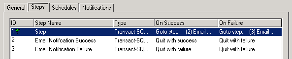 Open the SQL Server Agent and navigate to the list of Jobs. Select the properties of the job for which you wish to establish notifications. Then, click on the Steps tab. The screen displayed will resemble the following: