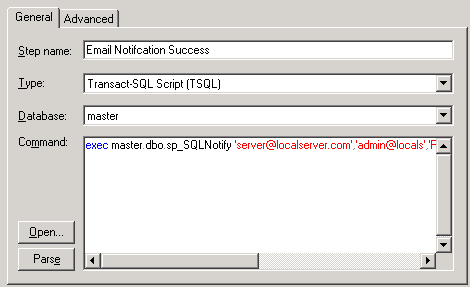 exec master.dbo.sp_SQLNotify 'server@localserver.com','admin@localserver.com','Backup Job Success','The Backup Job completed successfully'