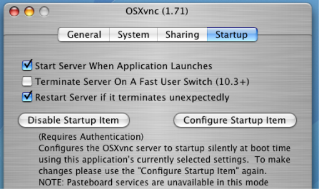 Launch the OSXvnc application and establish a password. Then, navigate to the "Startup" section and click "Configure Startup Item". After authentication, OSXvnc will be installed and running on your Mini. Finally, allow VNC traffic through your firewall. Open System Preferences and select "Sharing". Choose "Firewall" and click "Add...". Select "Other" for the port name, enter "VNC Server" for the description, and input 5900 for the TCP Port. Leave the UDP Port blank. Click OK and ensure the service is enabled.